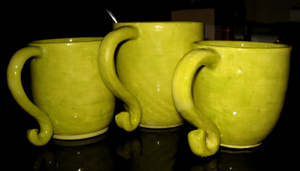 Contrary to what you may believe, these are a set. See? They're the same colour. And yes, I did weigh the clay before I made them. Somehow I still managed to make three completely dissimilar mugs. Oh well.